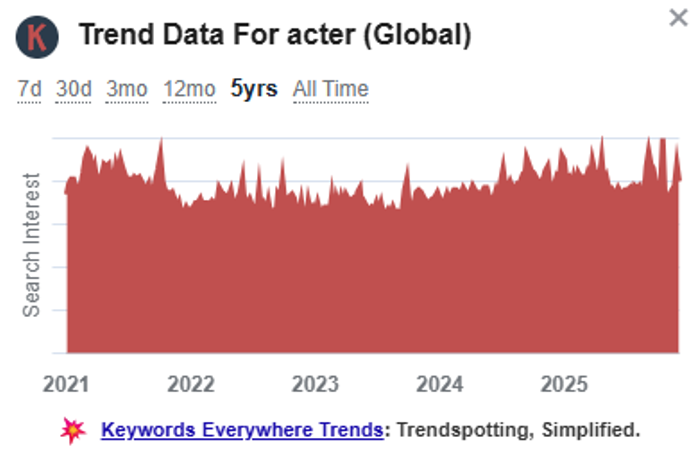 In Google search, keyword searches for the following “acter meaning “, ” acter or actor ” , “acter carton ” , ” acter definition” , “take acter” increased several times.