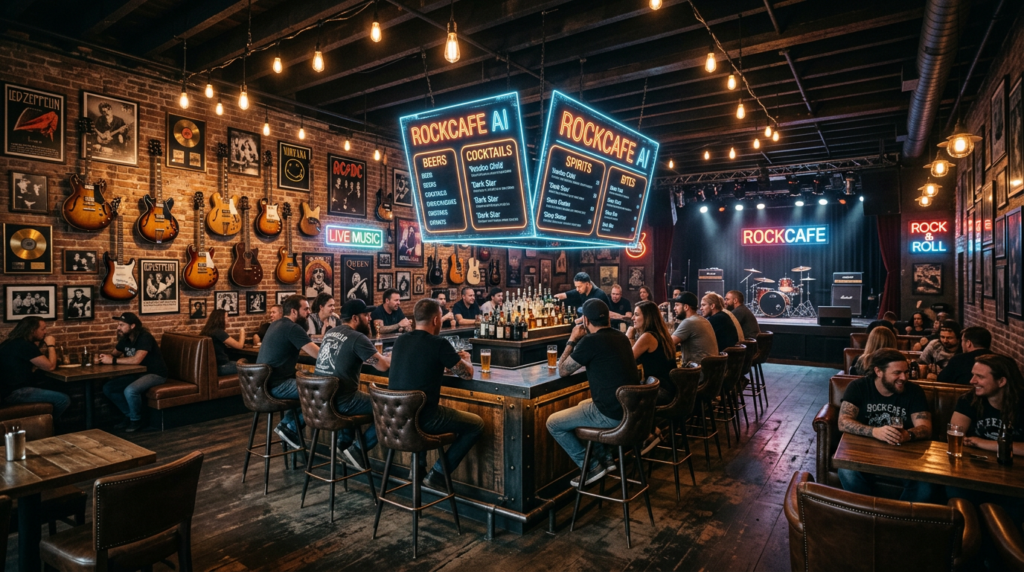 “Rock” can relate to music (rock genre), geology, orsymbolism of strength and stability, while “Cafe” denotes a social venue typically associated with food and drink, community, and casual gathering spots.