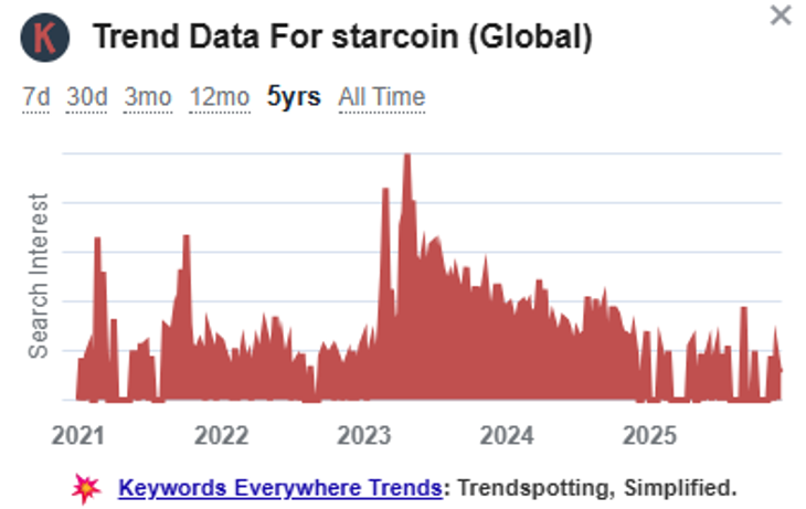 Looking at global trend data over the past few years, it can be seen that the search volume for “starcoin” on Google has increased several times.